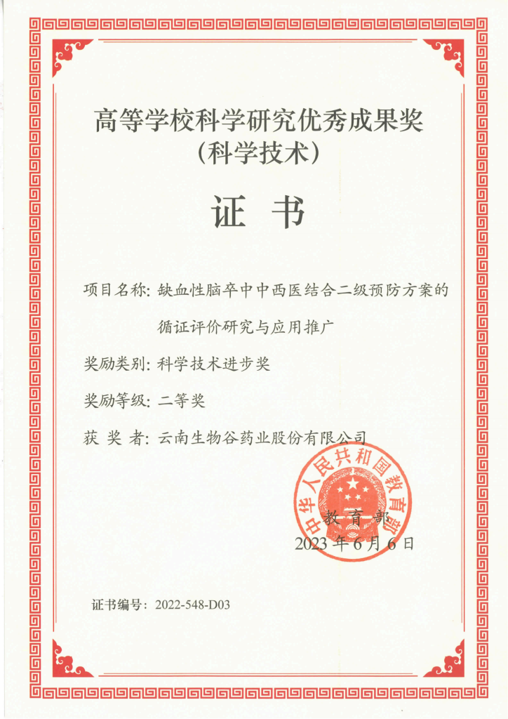近日,2022年度國(guó)家高等學(xué)校科學(xué)研究?jī)?yōu)秀成果獎(jiǎng)(科學(xué)技術(shù))獎(jiǎng)項(xiàng)評(píng)定頒布,由廣州中醫(yī)藥大學(xué)牽頭、云南生物谷藥業(yè)股份有限公司聯(lián)合共同完成的“缺血性腦卒中中西醫(yī)結(jié)合二級(jí)預(yù)防方案的循證評(píng)價(jià)研究與應(yīng)用推廣”項(xiàng)目榮獲國(guó)家教育部科學(xué)技術(shù)進(jìn)步獎(jiǎng)二等獎(jiǎng),這是本年度廣州中醫(yī)藥大學(xué)唯一牽頭獲得該獎(jiǎng)項(xiàng)的項(xiàng)目,也是我公司首度與高??蒲袡C(jī)構(gòu)研發(fā)合作獲得教育部重大獎(jiǎng)項(xiàng)。